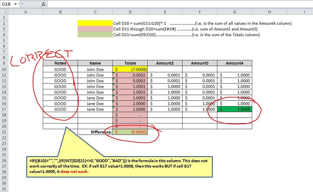 OTHERWISE if the different amount IS ZERO, then the word GOOD should display in column B for all rows.