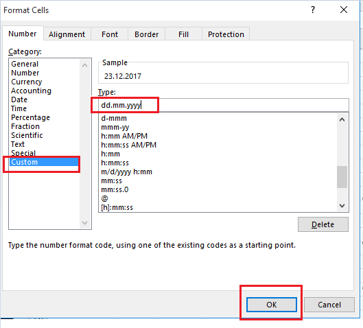 4.Please create a new Excel file, type some dates in it and set the date format as yyyy/mm/dd first, then check if you can change the date format to dd.mm.yyyy by customizing the date format via the steps mentioned above.