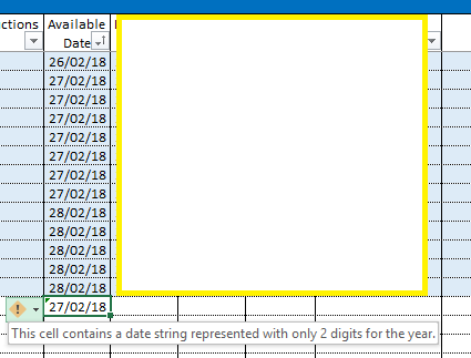 If we save the document and open it into Excel 2016 locally, it gives some strange errors to say that the cell is a 2 digit year which is actually correct, but Excel doesn't seem to understand that that is exactly what it should be.