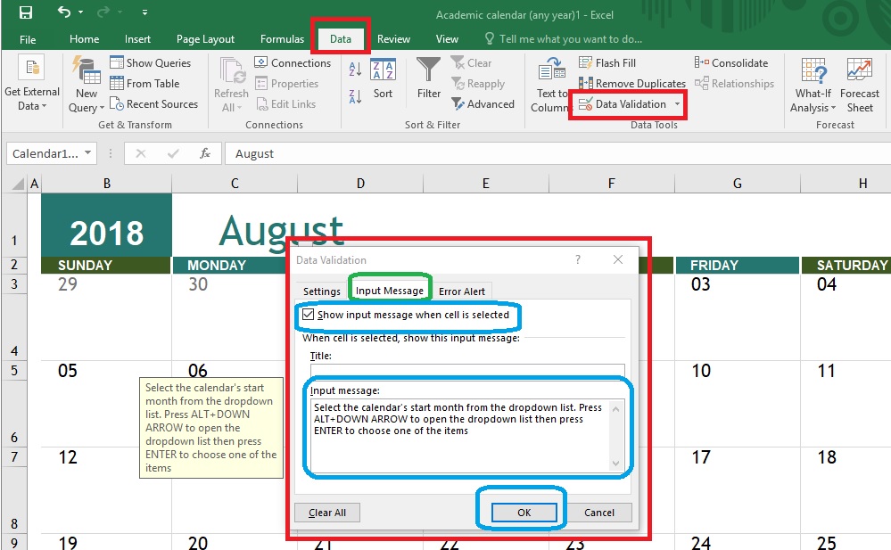 - Go to Input Message tab and then you can uncheck Show input message when cell is selected or delete the text in Input message box.