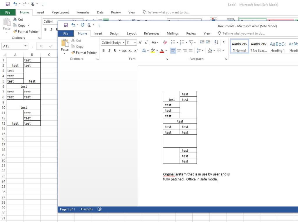word and paste it into excel the data shows. If you un-merge the cells and paste it back into word it shows all of the data. I tried this on a system that is not patched and the merged tables display properly in word. Why would an Office update break pasting