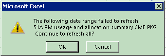 I have an Excel spreadsheet with multiple sheets that the refresh all works without error on Excel 2010 but on Office 365 Excel I receive the error: :The following data range failed to refresh: 51A RM usage and allocation summary Continue to refresh all?"