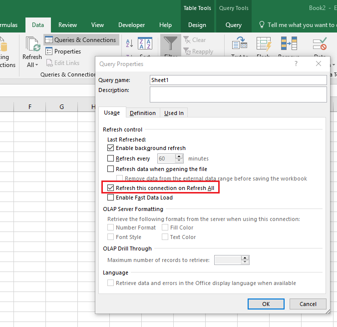 In Excel workbook, go to Data tab, in Queries and connections, click the Refresh all arrow>Connection Properties, under Usage tab, check if Refresh this connection on Refresh all check box is enabled.