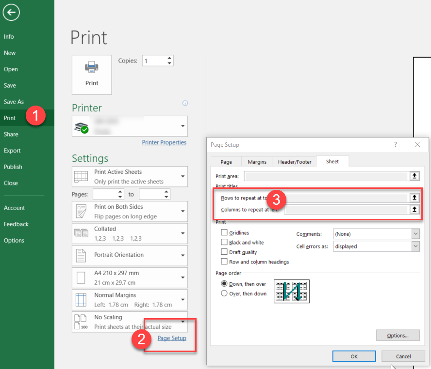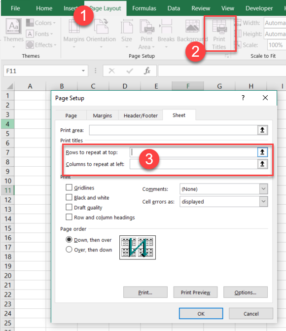 I ran into this issue today, for the first time on a new workbook I just created. I use the ribbon Page Layout>Page Setup >Sheet, but the "rows to repeat on top" field was grayed out.