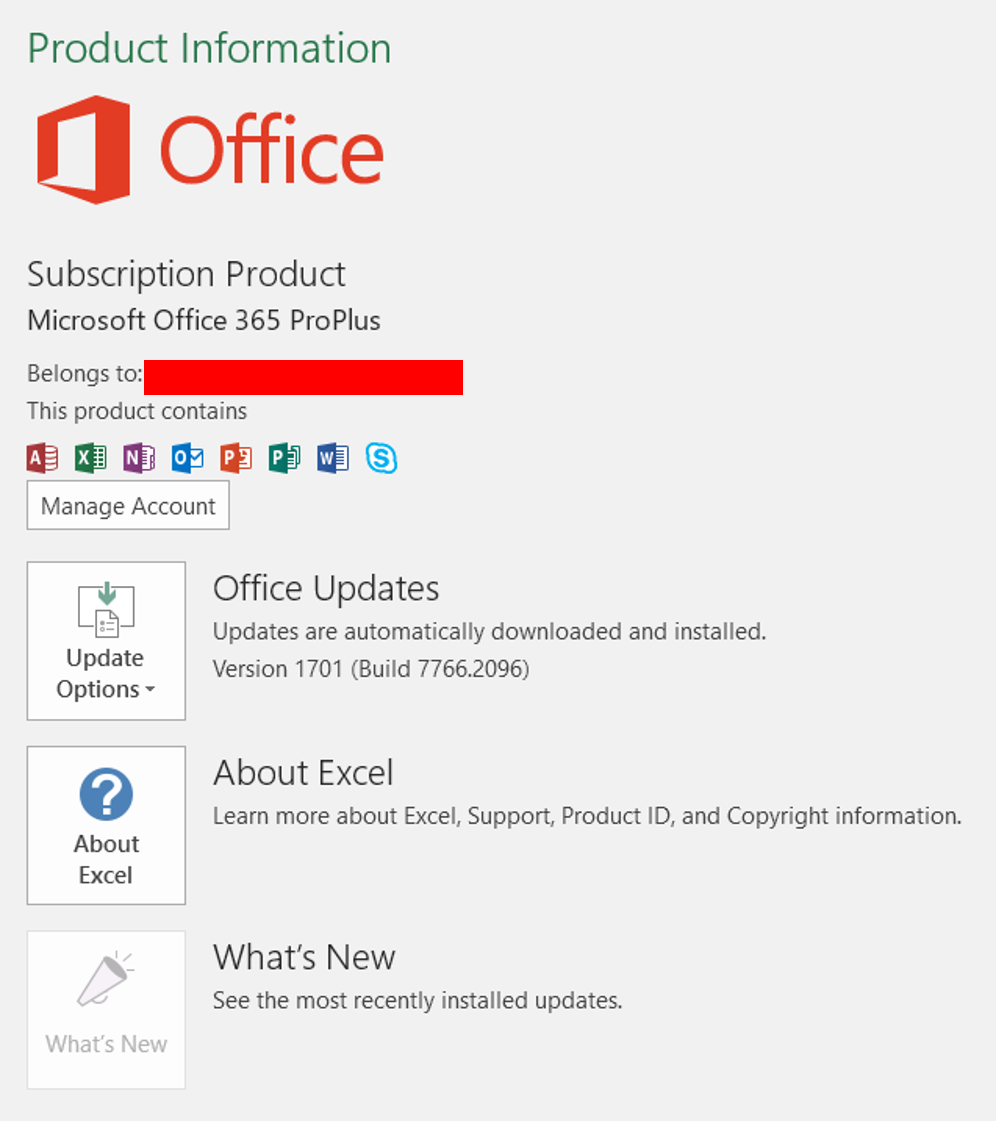 - Open Excel>File>Account>capture a screenshot of all info under Product Information. Please mask your account info in the screenshot.