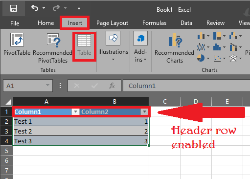 A. Table created by using the Insert Table option in Excel. Header Row is enabled.