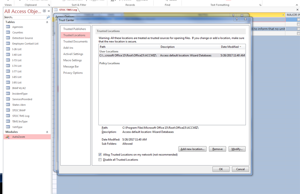 2017-05-26T16:25:21+00:00 Are you saying you moved the file to the ...\ACCWIZ folder? If so, that's not a good place for it. Instead, you should add a new trusted location, maybe your Documents folder, or whatever folder you currently have the database in.