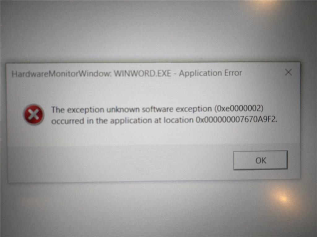 At top of error box it says "HardwareMonitorWindow: WINWORD.EXE - Application Error"