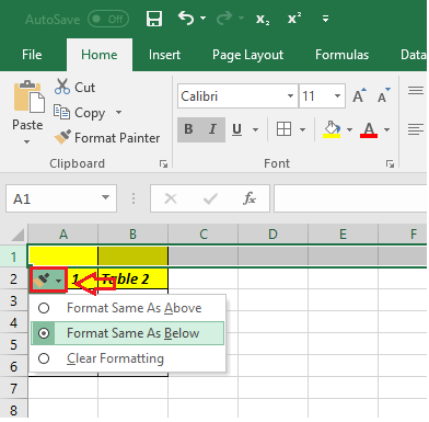 - Format Same as Above: Applies formatting to the inserted row to match the format of the rows above.