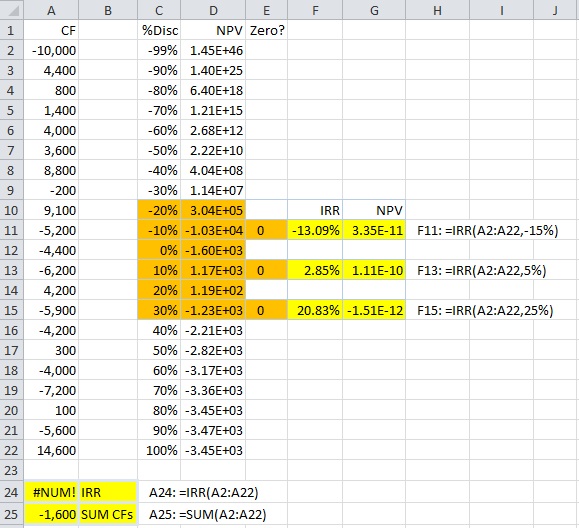 But the NPV table (D2:E22) shows that the NPV curve crosses zero not just once, but three times. In other words, there are three mathematical IRRs (!).