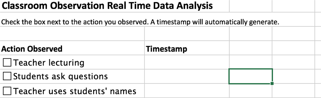 That mostly worked, with a slight glitch. The date appeared, but not in the adjacent cell. It posted in the adjacent cell in the row above (for teacher lecturing, it posted over the 'timestamp' label). Do you know how I can fix that? Is it something in the code?
