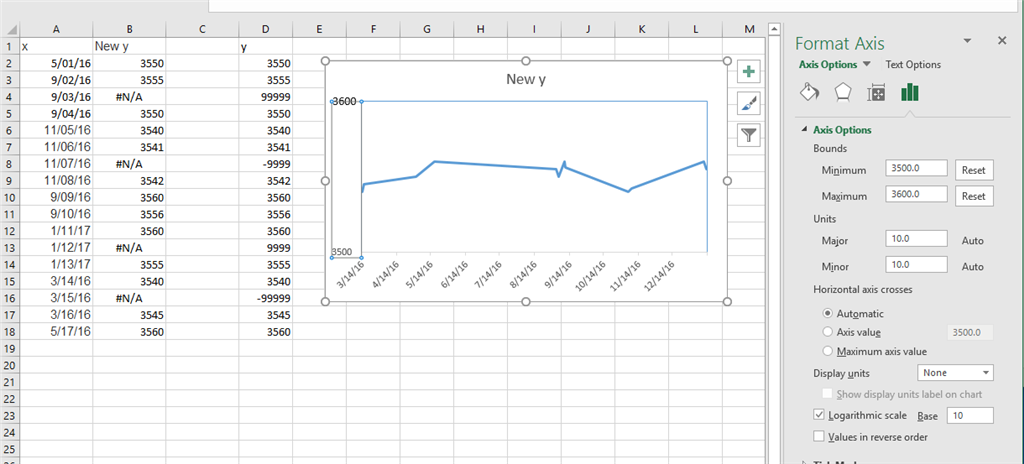 I need to plot the following dataset with Y-axis in log scale. Only interested to plot the data between 3500-3600 range. Large data represents error therefore can be omitted. I am having problem defining the axis to plot the data. Any help is highly appreciated.