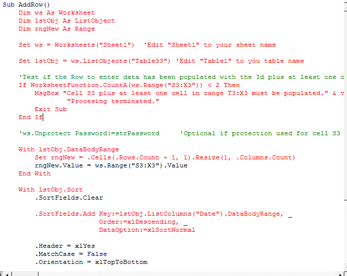 the "Add New Data" section. You will also see that there is a test line of code to ensure that the user has entered data in at least one cell in addition to the Id number before it will copy the data to the table. Because the new data is cleared after copying,
