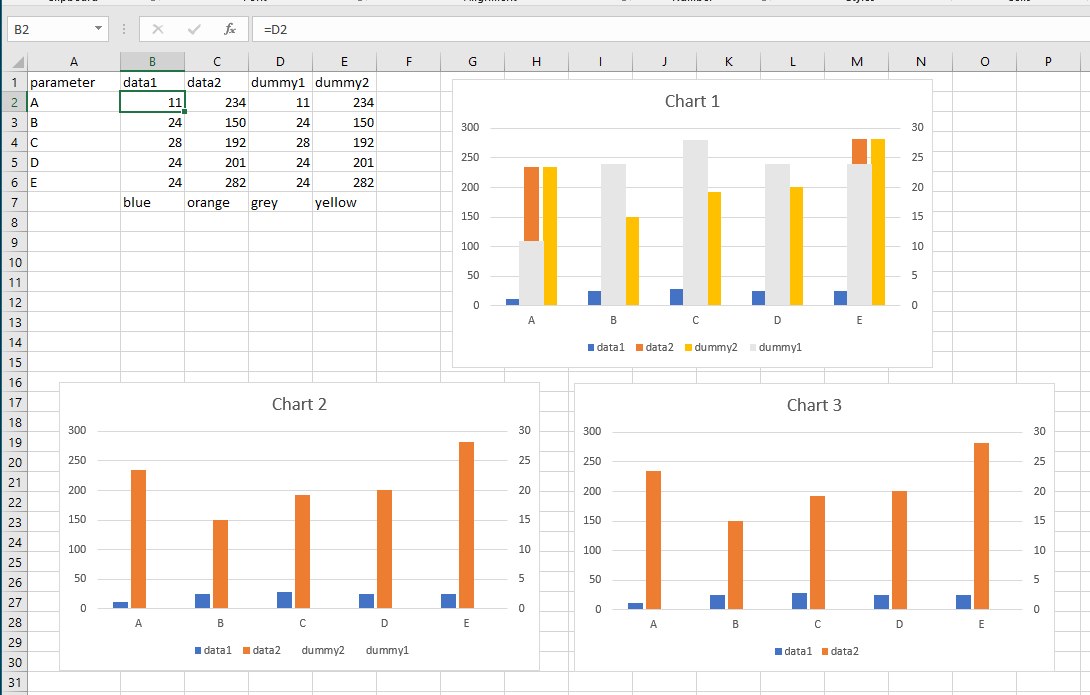 Formatted the dummy1 data and the dummy2 data to have no fill and no border data columns to have no fill and no border - Chart 2