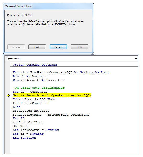 It says, I must use 'dbSeeChanges' option with OpenRecordset. The below module shows yellow highlighted line where the error is. How should my module look like?