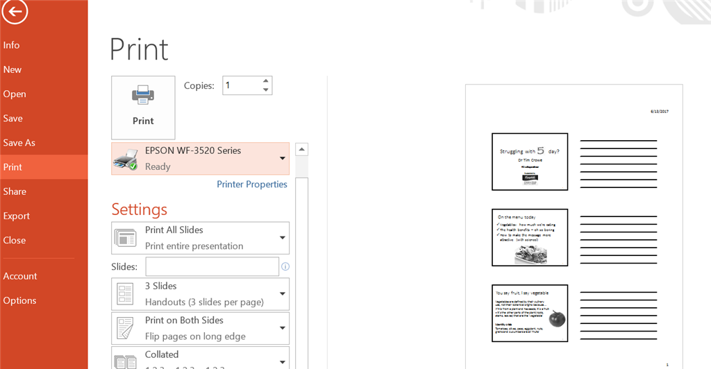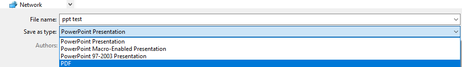If you want to directly change the printer to PDF in Print option, it is not feasible. I suggest you saving the presentation as PDF to local first and then print it following the steps below: