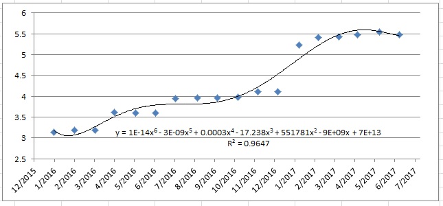 I'm pulling data (the stuff below) and I want to create a polynomial regression that will predict the next number. The problem is, I don't want to have to go through the charting process or the data analysis because I will be doing this for roughly 500 different items. Is there a way to do it via some sort of formula?