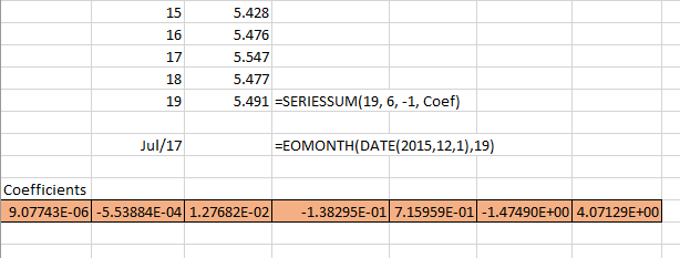 Note that I put the trendline extrapolation (months 19 through 22) off to the side (F14:G18) to emphasize that we can calculate the SERIESSUM anywhere, not just parallel with the original data.
