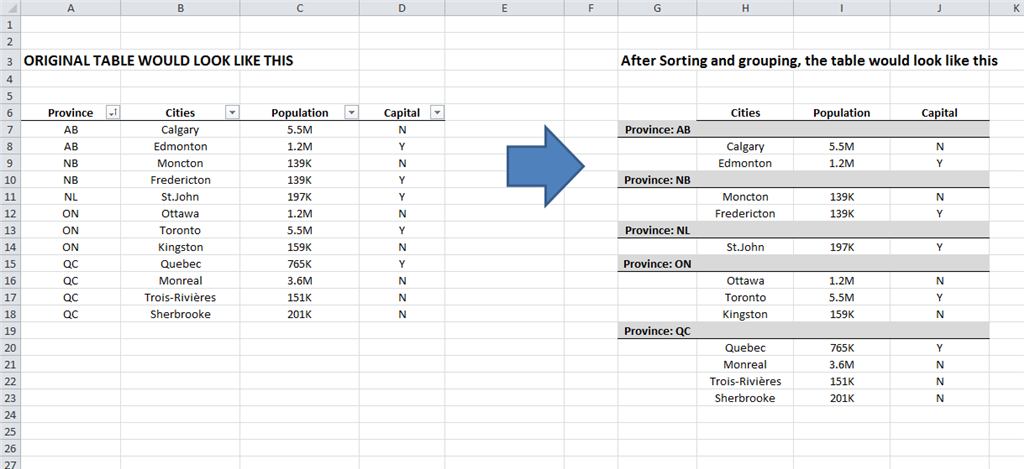 It's pretty simple in Access when one makes a report to have grouping headers, but I want to stay in Excel for some reasons... the goal would be to have a table formatted with headers that would group lines based in a single column values.