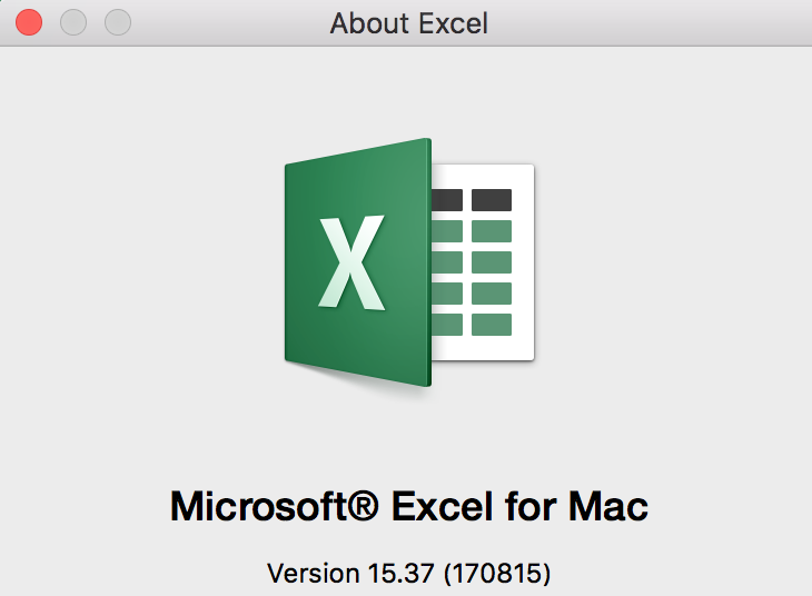 Meanwhile, in Excel, go to the Excel menu and choose About Excel, confirm the version and build.