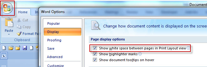 Click on the Office button and then on Word Options and then on Display and check the box for "Show white space between pages in Print Layout view".