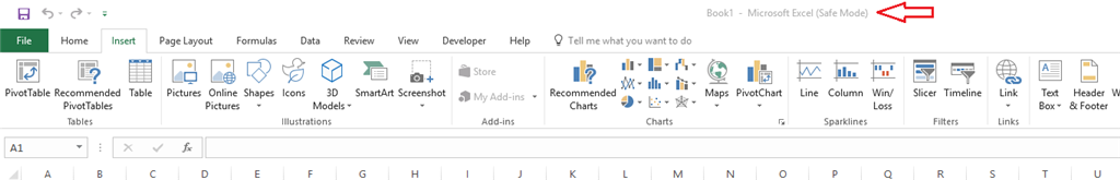 Once you start Excel in safe mode, you’ll see Safe mode on the title, as shown below: