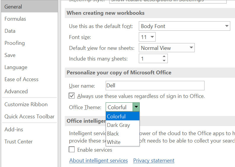 The first place to try is File menu > Options command > General option > Personalize your Copy of MS Office section