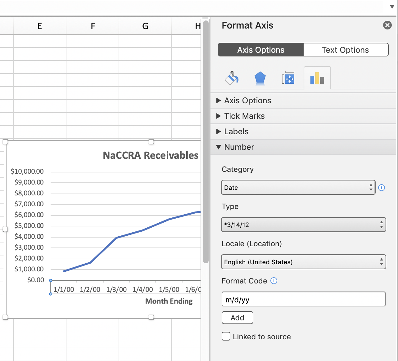 In the Format Axis pane, click the disclosure triangle for Number, and then change the Category to Date and choose a Type.
