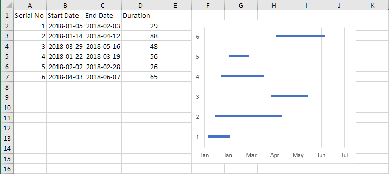 (about 30 serial numbers total) and I would like the horizontal x-axis to be the timeline (months Jan - Dec). I would like straight, horizontal lines indicating the date range that the equipment was installed. This way it can be easily visually determined