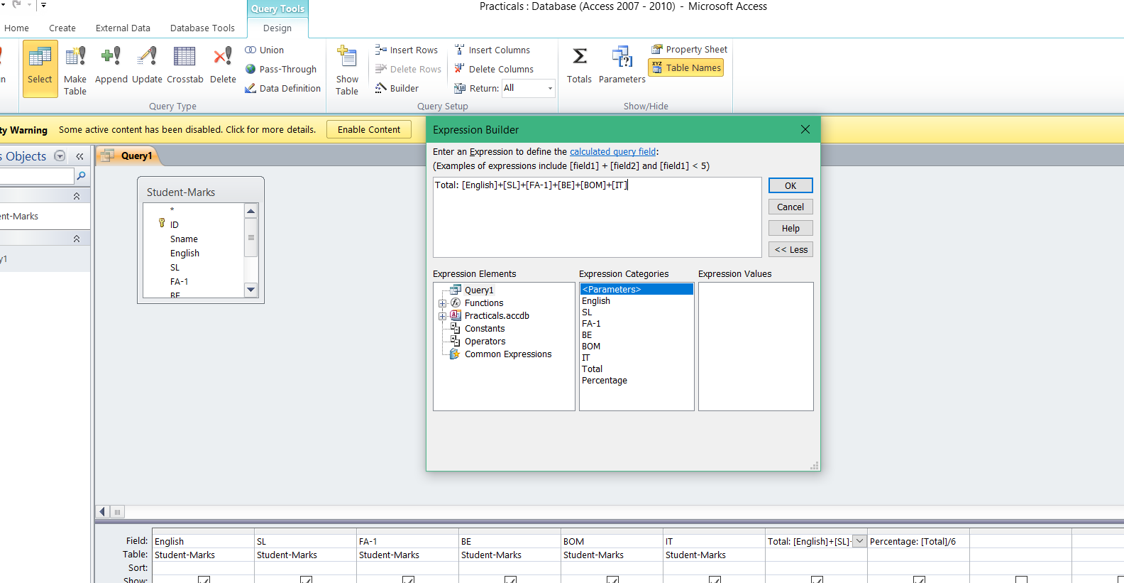i am learning how to use ms access . i have the office 2010 version of ms access . i am unable to do addition of fields in Expression builder (query design)