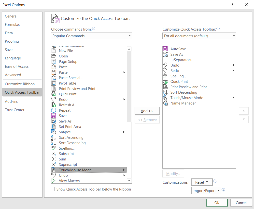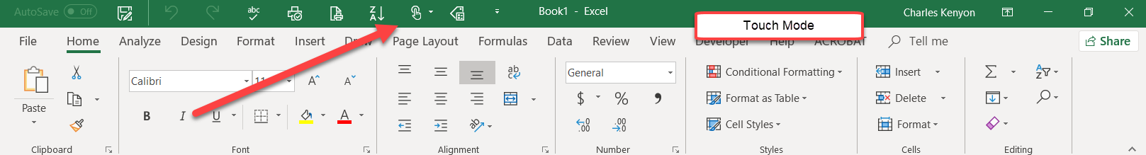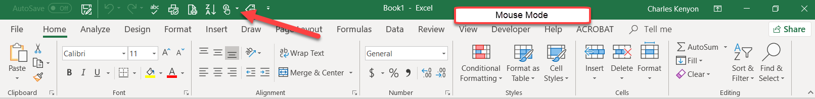 Add the Mouse/Touch Mode to your QAT. Select Mouse Mode.