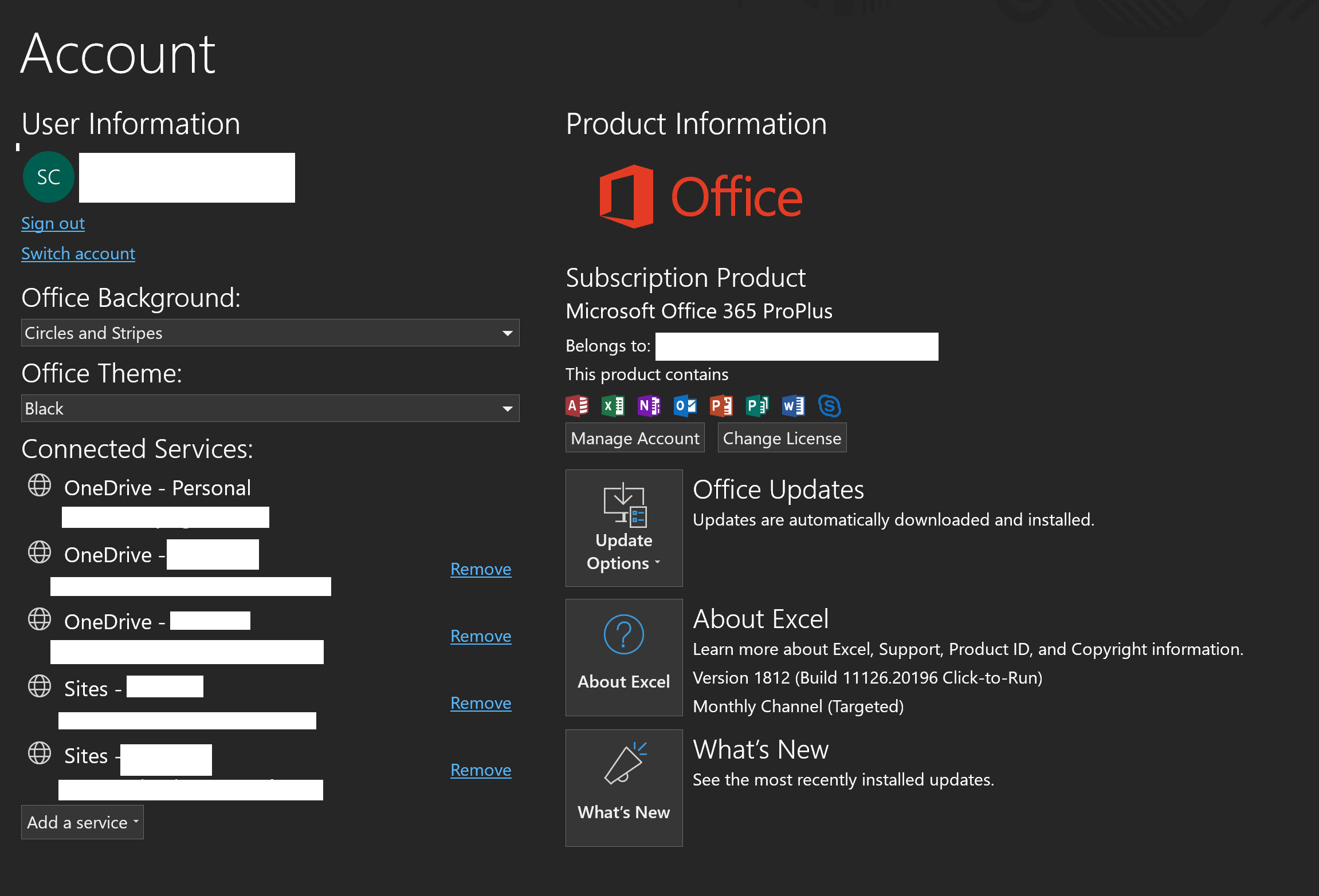 Please first upload a full screenshot of the Account page in the current Excel 2016 application you are using for our clarification. You can access the page via File>Account.