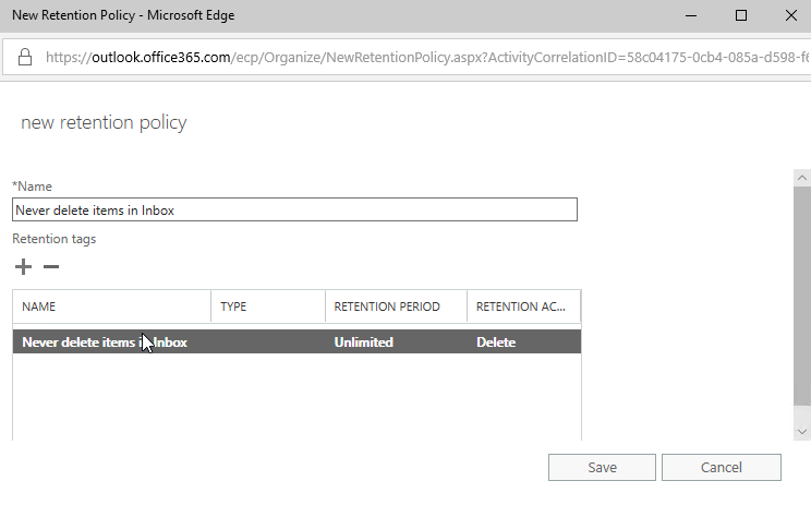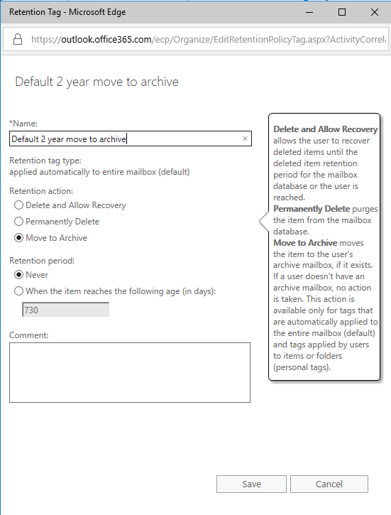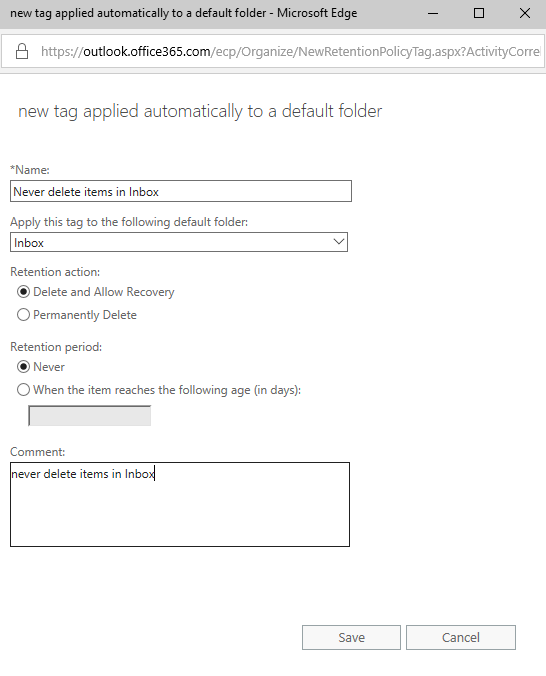 - “If you edit the default Retention Tag, you cannot set it to be Never Delete”.