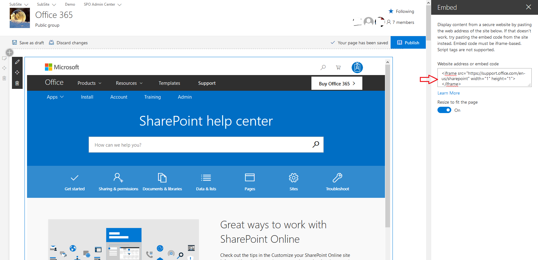 To embed the support site https://support.office.com/en-us/sharepoint, please use the following iframe code.