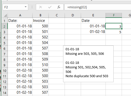 Column A continues day after day with the invoice number count resetting to 500 every day.  I need to know how many invoice gaps there are everyday.  Not what numbers are missing, just how many.   For example on 1/1/2018 there are approximately 3 missing invoices and 2 missing invoices on 1/2/2018.  Thank you!