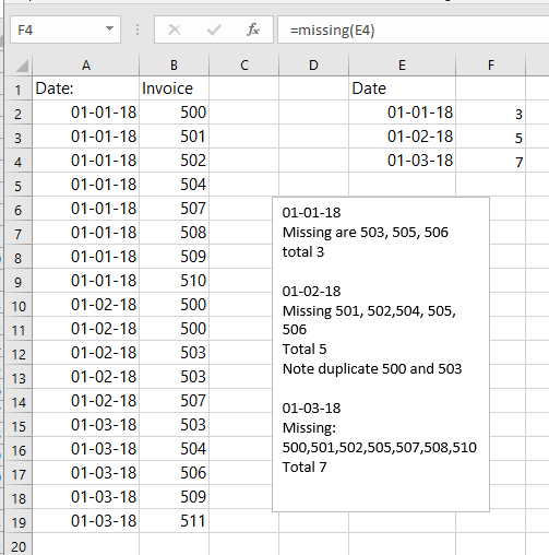 Column A continues day after day with the invoice number count resetting to 500 every day.  I need to know how many invoice gaps there are everyday.  Not what numbers are missing, just how many.   For example on 1/1/2018 there are approximately 3 missing invoices and 2 missing invoices on 1/2/2018.  Thank you!