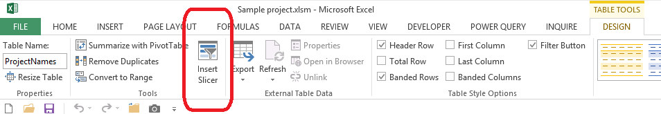 The Slicers button you expect is available in 2013 and above in the Table Design tab.