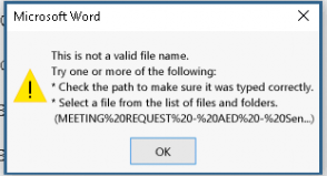 The special characters are not accepted by Word when they are in filename and file path. You may check the file path(Right click the file > Properties) and see if one of the following is in the path: > / | \ :