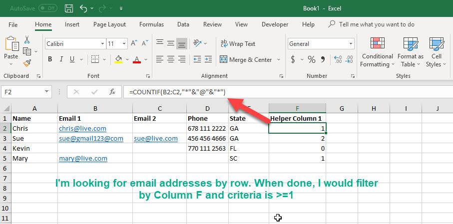 2018-07-12T11:28:34+00:00 You can keep the conditional formatting turned on if you want, but now the issue is the emails go across instead of down. I would add a helper column in Excel. In my example in the screenshot, it is column F. The formula to find email addresses in a row is =COUNTIF(B2:C2,"*"&"@"&"*") I'm looking for the @ symbol in that formula.