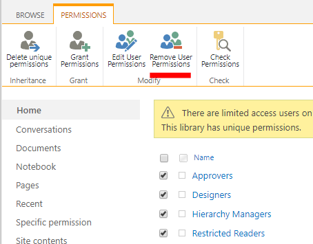 4.Choose the people or group whoever you don't want them to have permission to this library, and click Remove User Permissions.