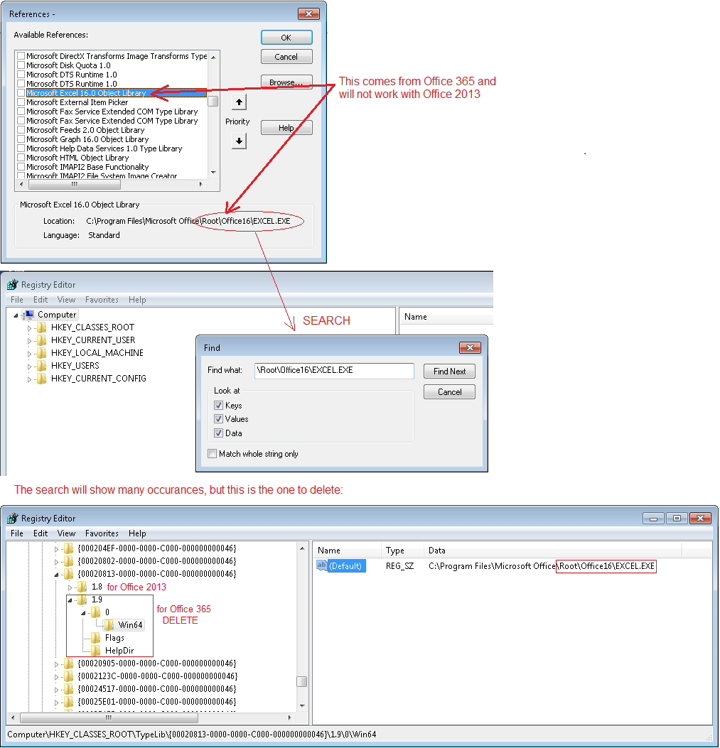 We were having random issues with our Office 365 (64-bit) installations on at least two computers experiencing intermittent "is not responding" and "has stopped working" messages when running MSACCESS.EXE alone or simply opening a new blank MS Access instance. This problem occurs more frequently when multiple instances are open and running at the same time (but that's another story). So our IT department eventually decided to revert or downgrade back to our non-365 Office 2013 Pro (64-bit) product, which was proven to be reliable and stable before we upgraded to the 365 version. But after uninstalling 365 and re-installing Office 2013, we ran into a new situation where our VBA based solutions could not find the correct Object Libraries for Office 2013. It kept referring to the previous Office 365 library which had already been uninstalled. So this appeared to be a registry problem.