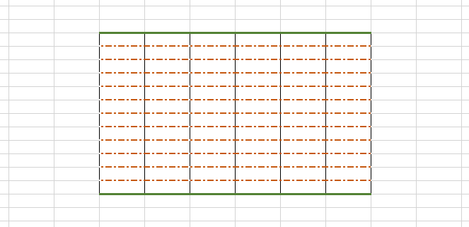 Below is a grid of cells from a workbook with different border colours and styles applied. Note that the gridlines are dotted.