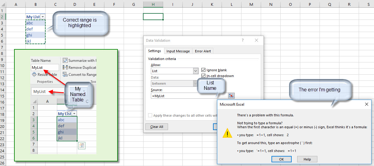 You can reference a table directly for the list. You need to use INDIRECT and the table and column name. Like this: