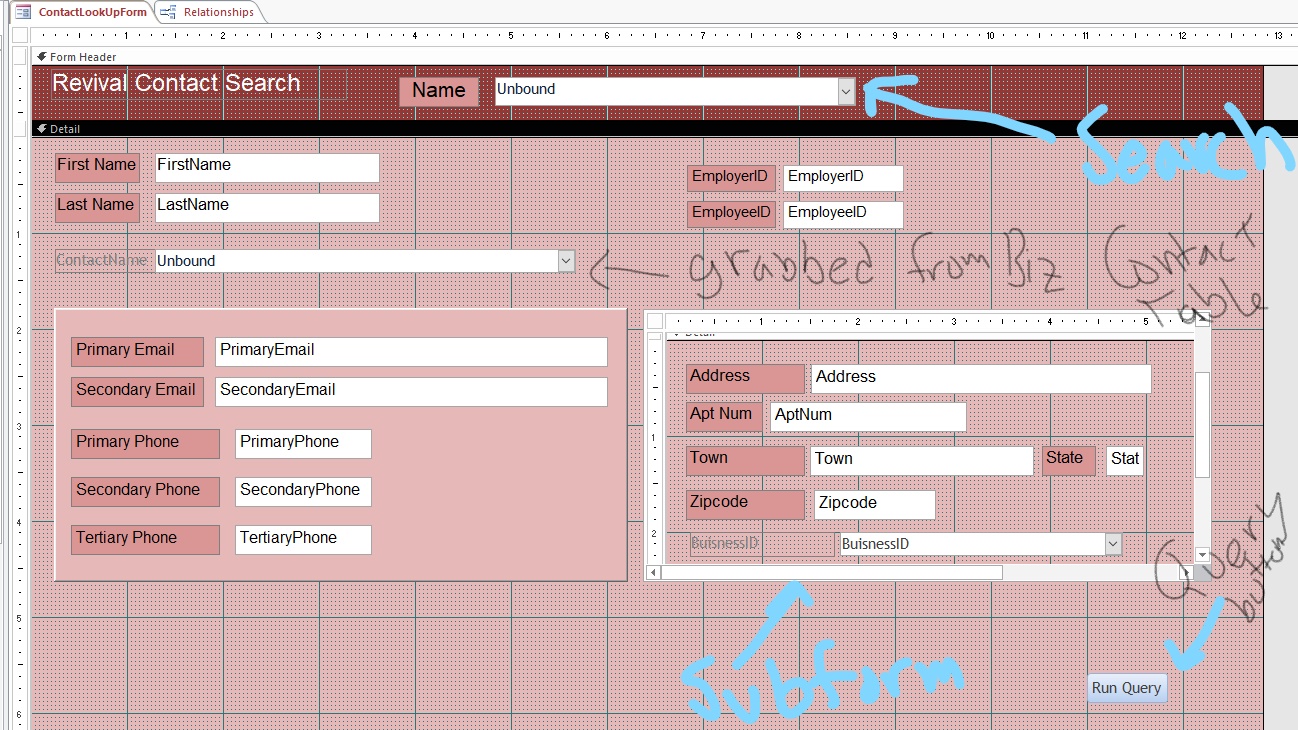 the Contacts table in the detail section of the parent form, with secondary data from the same table on page 1 of a tab control. The other pages of the tab control will each have a subform based on one of the referencing tables, which might be subtypes or