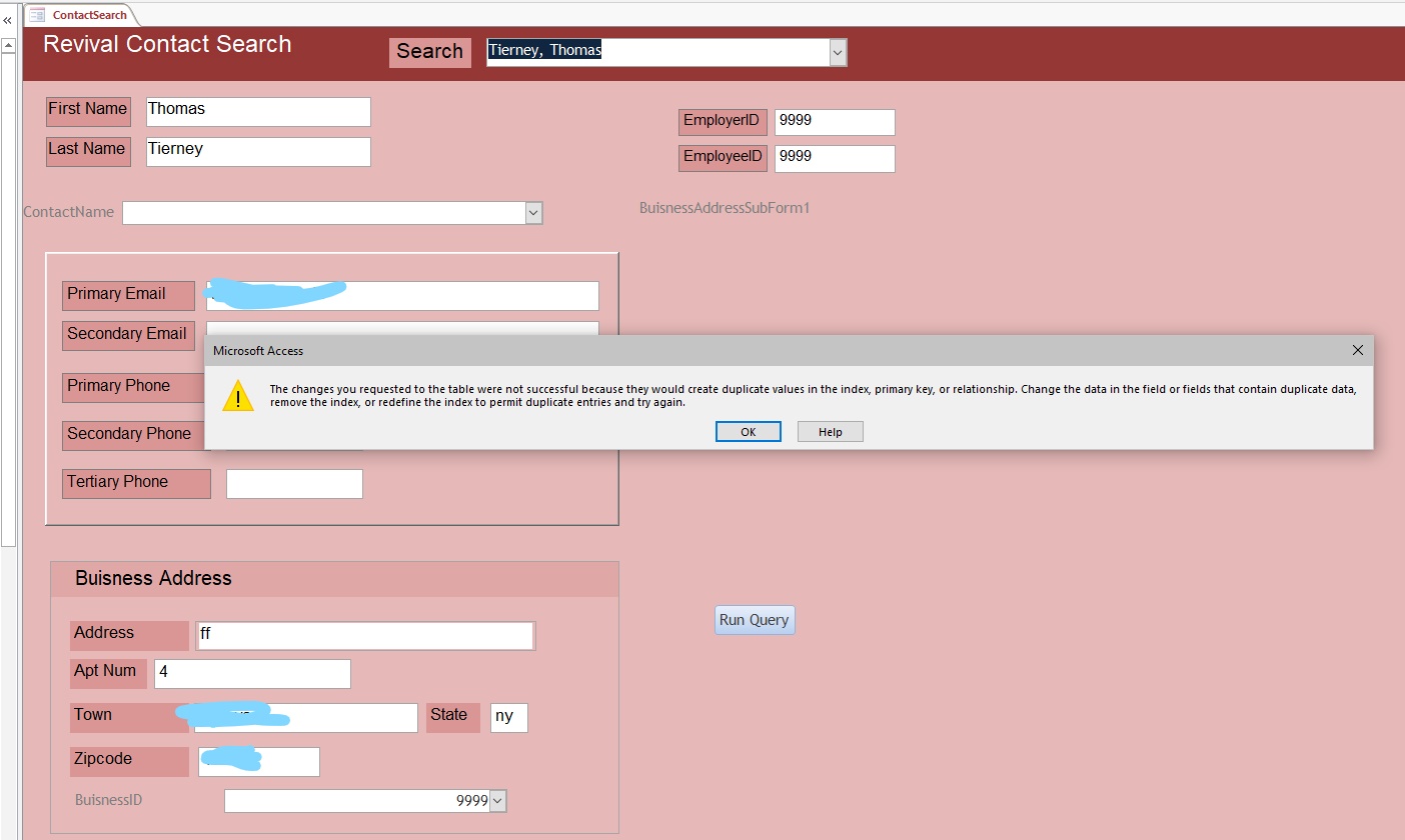For data entry there would be, within each sub-type subform further subforms based on queries which, for example would restrict the email addresses or phone numbers on the ContactCategoryID value relevant tom that subform. The DefaultValue property of a hidden