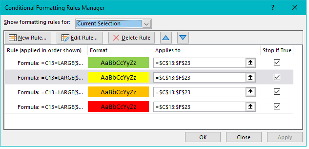 For each row, I would like to apply the 2-colour scale conditional format to show which values are highest and which are lowest (and which come in between).