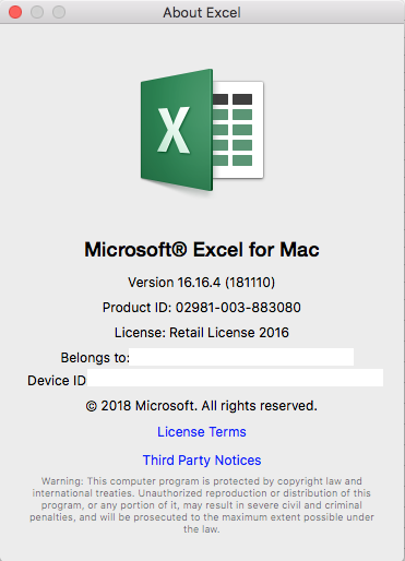 I recently purchased a copy of Excel 2016 for Mac (16.16.1)