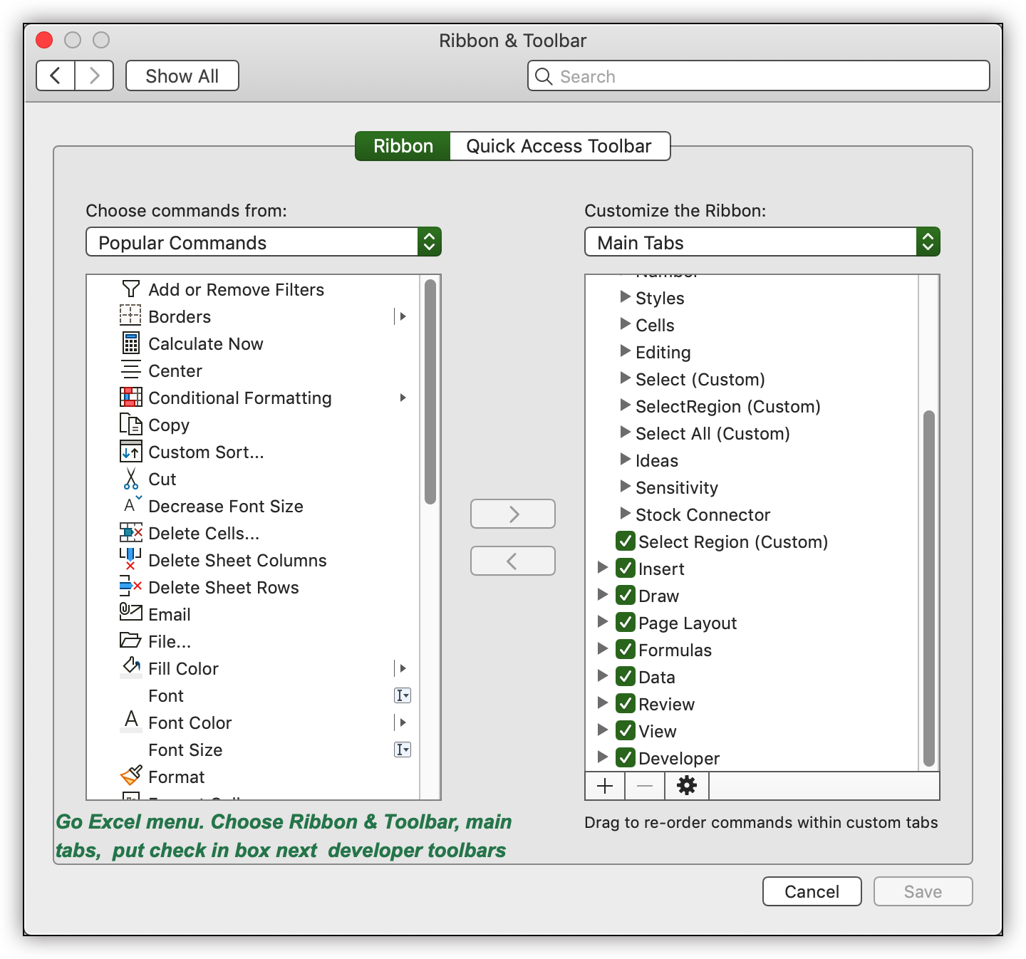 To activate the Developer tab go to Excel> Preferences - View, then check the box at the bottom of the pane.