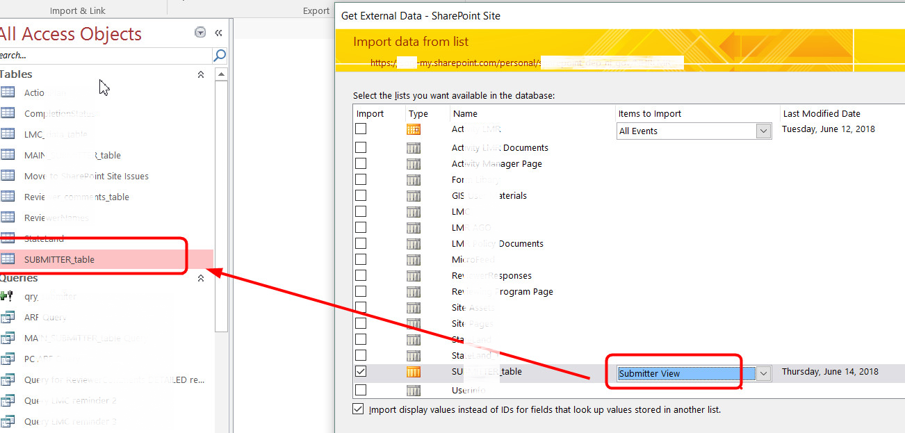 SharePoint import of List "VIEW" to Access database returns "Could not find file". Import works for other List "VIEW"