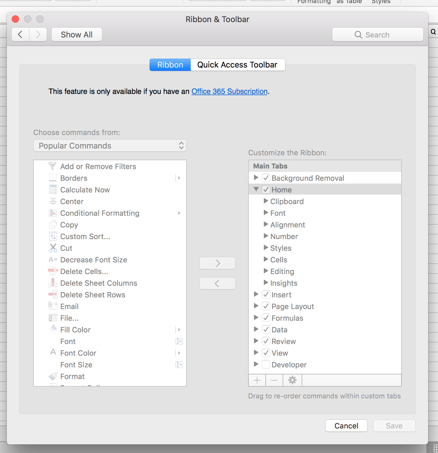 is greyed out. To be clear I am on a Mac and I go to Excel -->Preferences --> Ribbon & Toolbar and all of that screen is greyed out.